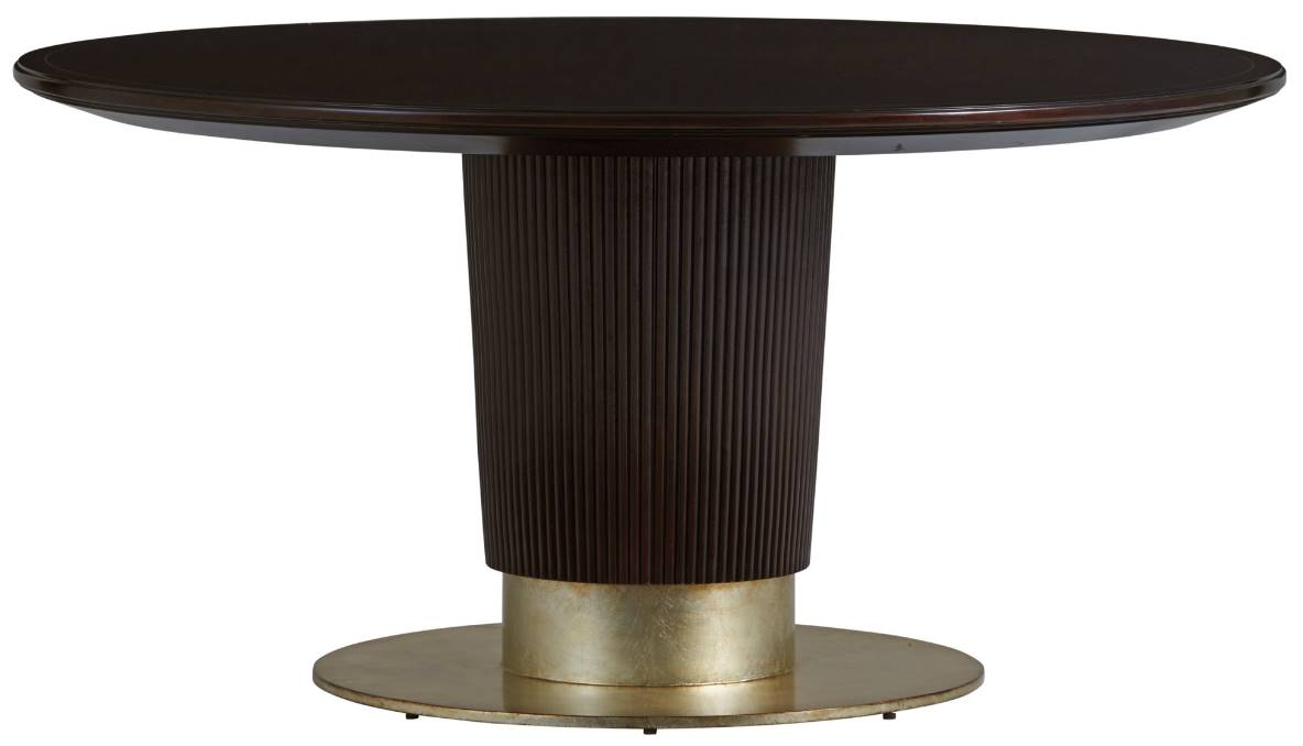 The 60-inch diameter Waldorf dining table offers a dramatic approach to stylish dining. A radial pattern of walnut veneer on the top is accented at the perimeter by a gold stripe. The tapered reeded column terminates with a metal base finished in antiqued silver leaf. The design comfortably seats six guests.Read More