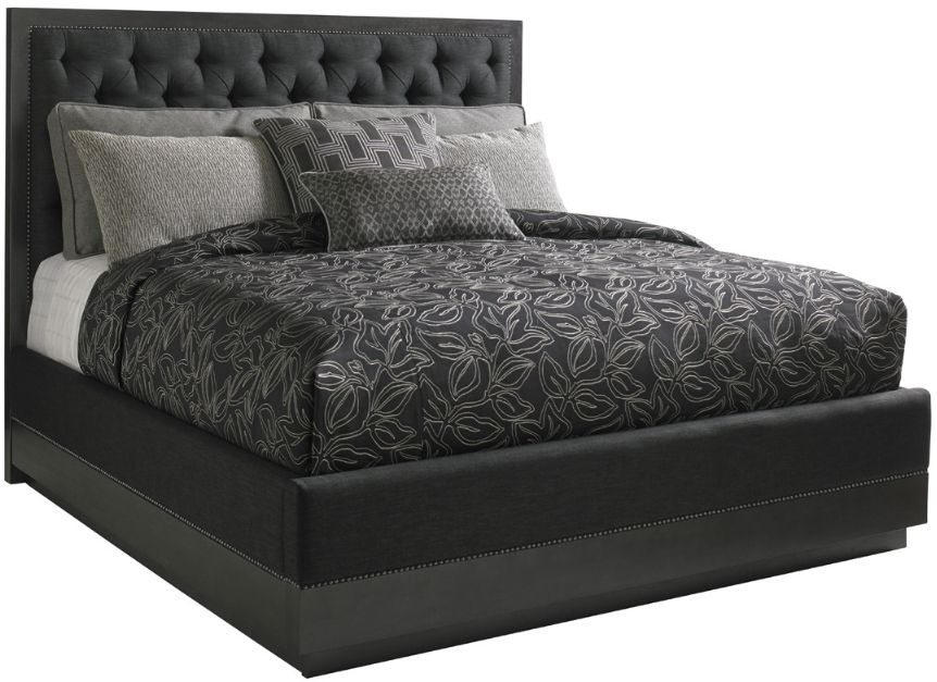 Clean architectural lines highlight deep button tufting and nailhead trim on the upholstered headboard creating a contemporary look. The sophisticated carbon gray finish, sleek metallic graphite hardware and smoked gray glass fashion an unforgettable look, and a new interpretation of chic contemporary design.Read More