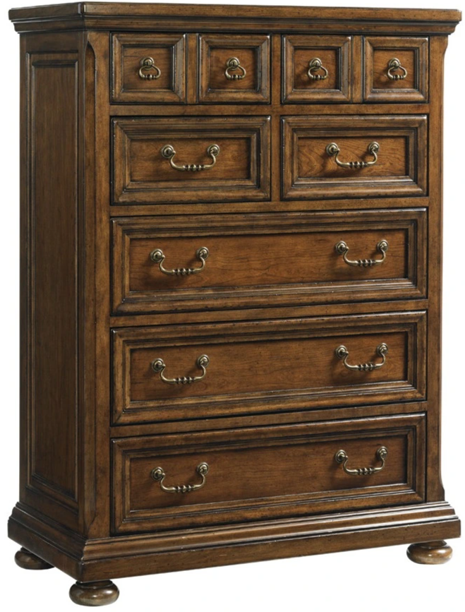 Offering a distinctive silhouette, the drawer chest features deep moldings around its seven drawers and end panels and generous bail pulls in an antique brass finish. Its plinth base sits on gracefully shaped bun feet.Read More