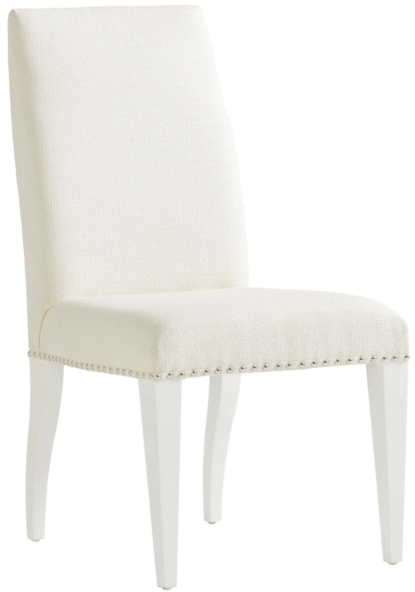 The clean transitional design of the Darien side chair is accented by spaced nailhead trim in polished nickel. The standard fabric is 221811 Sebring, a tightly woven chenille construction, performance fabric, in an artic white coloration.Read More