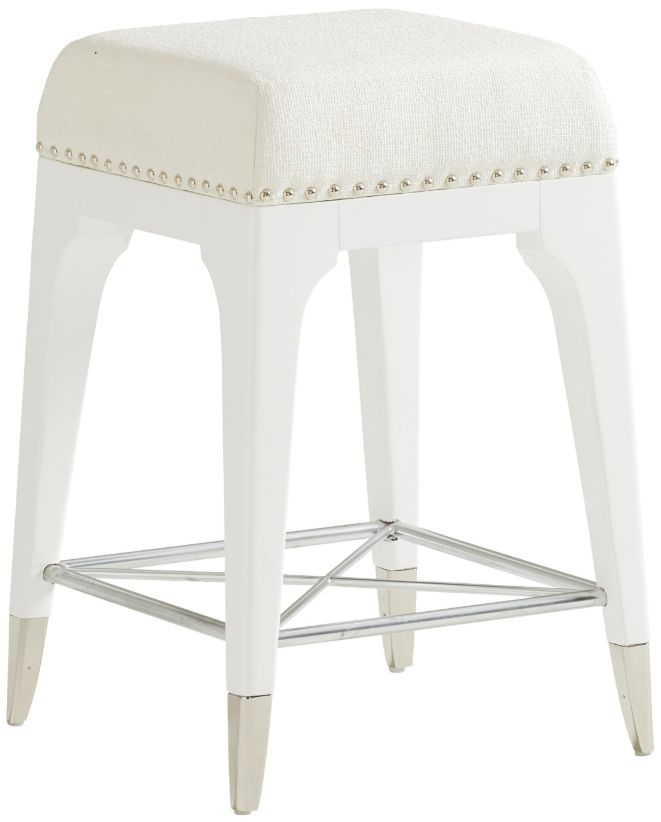 The Northbrook counter stool offers a bold transitional design statement. The silhouette features spaced decorative nailhead trim around the seat and a cross-stretcher and ferrules at the base. The nailhead trim, stretchers and ferrules are all finished in polished nickel, giving the piece an eye-catching sparkle.Read More