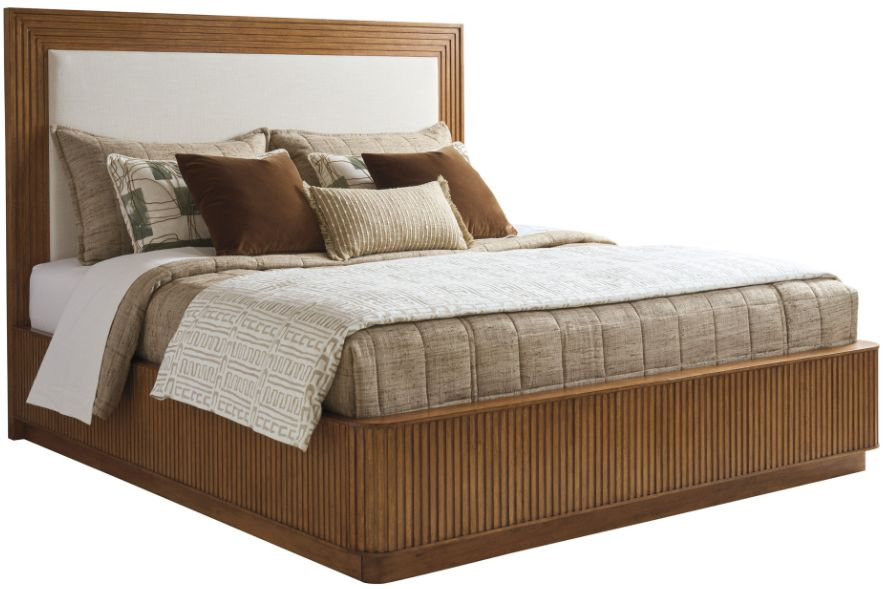 The Pendry bed features an upholstered headboard panel framed by fluted molding. The side rails and footboard have vertically fluted detailing, with soft radius corners on the footboard and a recessed plinth base. The upholstered panel is standard in 2343-11 Sailview, an indoor performance fabric with a linen weave and soft hand.Read More