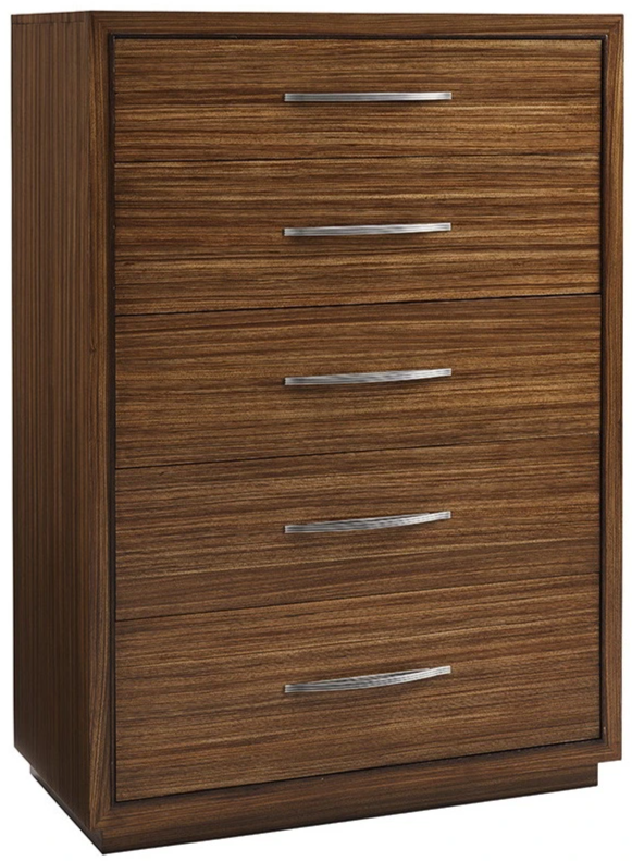 With five full-extension self-closing drawers, this chest offers generous storage and a sophisticated look, with Zebrano veneer running horizontally on the drawer faces and vertically on the end panels. Custom hardware has a soft, brushed stainless finish.Read More