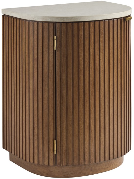 The Aviara demilune nightstand offers a perfect option for smaller bedrooms. The design features fluted detailing, a veneered Anticato marble top, a concave stationary shelf behind the door, and a recessed plinth base.Read More