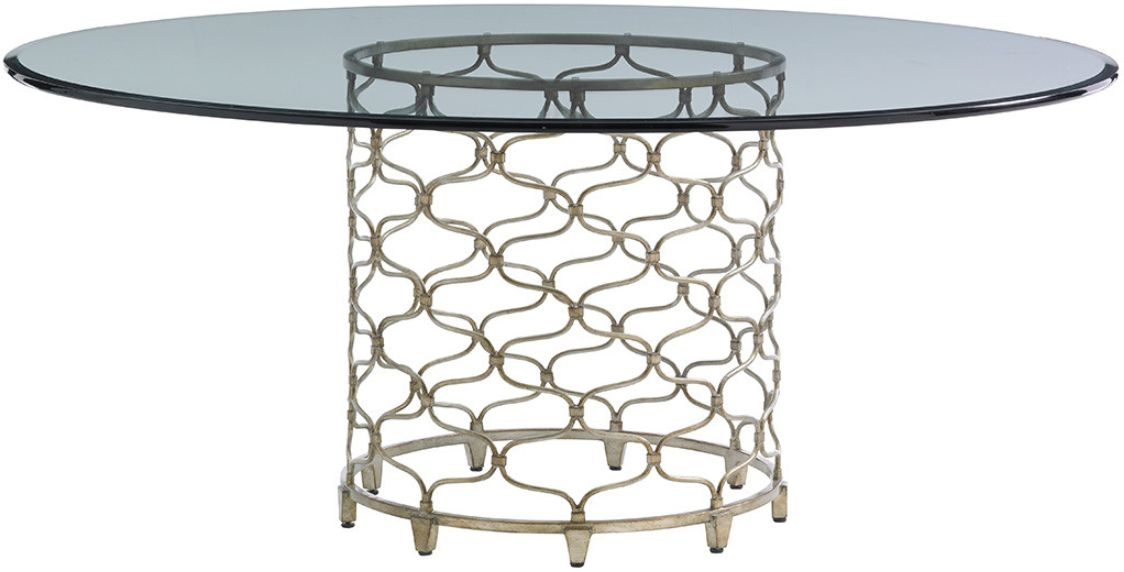 The decorative metal base takes its cue from fashion and the popular cuff bracelets, even the hand-burnished silver leaf finish is appreciated for its handsome detail. The 72 inch diameter glass top is three quarters of an inch thick with a one-inch beveled edge.Read More