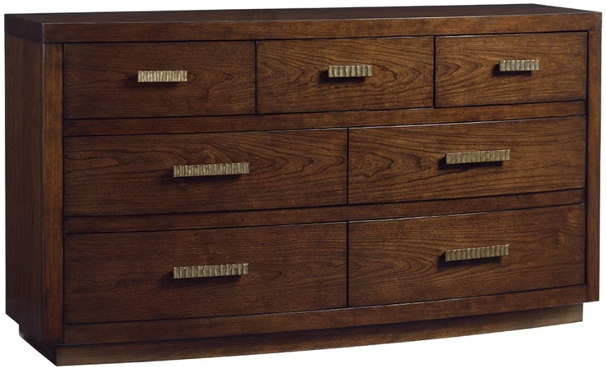 This seven drawer dresser offers a soft convex front finished in a warm mocha finish with soft gray undertones and is elegantly complemented by custom designed drawer pulls in a lightly burnished silver coloration.Read More