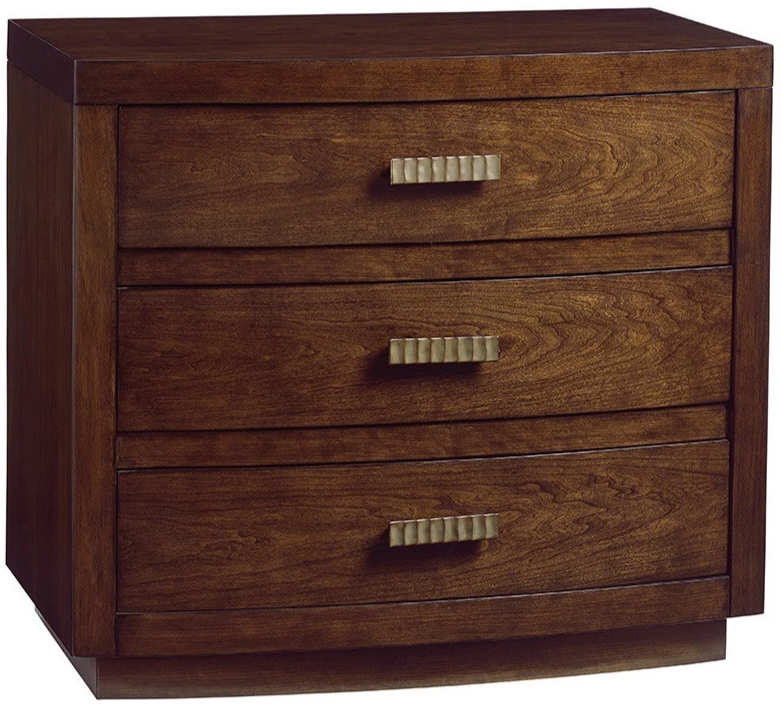 This three drawer nightstand offers a soft convex front finished in a warm mocha finish with soft gray undertones and is elegantly complemented by custom designed drawer pulls in a lightly burnished silver coloration.Read More