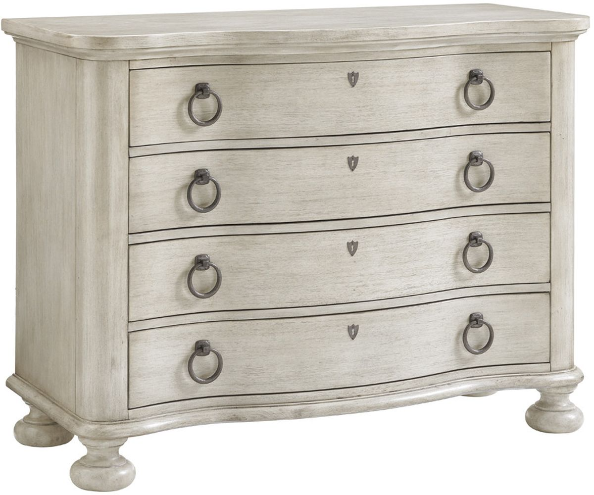 The 48-inch chest, with a soft serpentine front, decorative ring pulls, turned legs, and four drawers for storage offers a dramatic nightstand option adding a redefined touch to any master bedroom setting.Read More