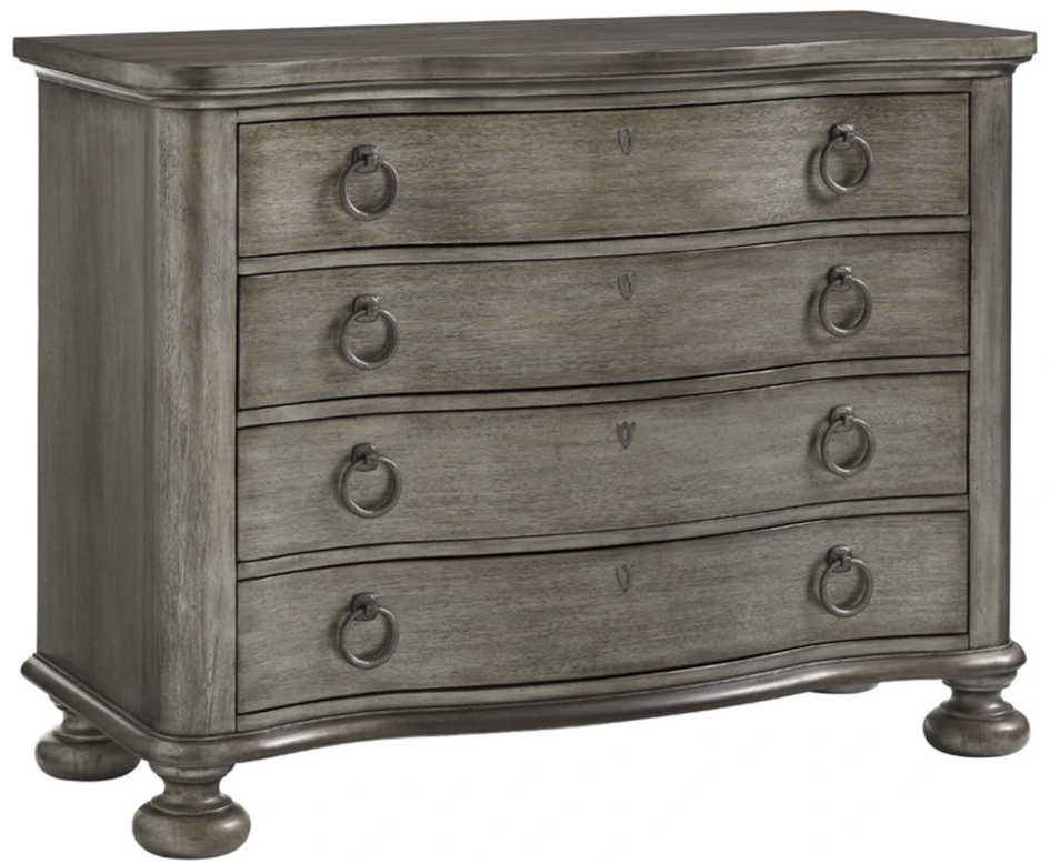 The 48-inch chest, with a soft serpentine front, decorative ring pulls, turned legs, and silver-gray finish offers a dramatic nightstand option adding a redefined touch to any master bedroom setting.Read More