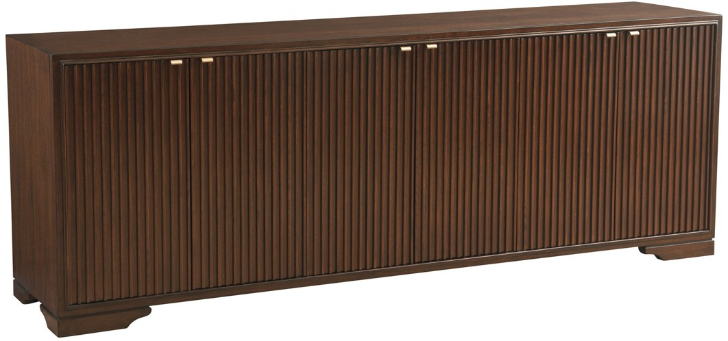 The Brentford media console features vertical reeded detailing on the six doors across the front of the piece. Behind each pair of doors is a soft-closing drawer and two adjustable shelves. The back panel is ventilated to accommodate electronic components.Read More
