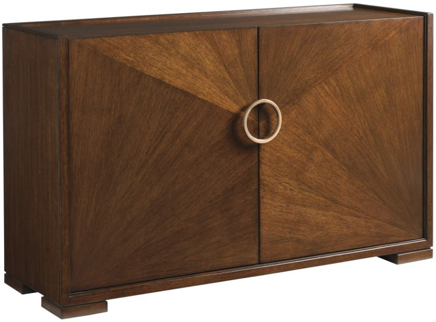 The Kilburn hall chest is a signature piece in the collection, featuring a geometric pattern of quartered walnut veneer on the doors accented by a custom round door pull. Behind the doors are two soft-closing drawers with rose gold hardware and two adjustable shelves for storage.Read More