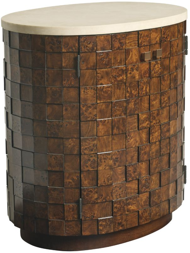 The Morella oval nightstand features dimensional walnut burl around the perimeter and a solid Bulgari beige marble top. Behind the two doors is a stationary storage shelf. This piece will definitely add style to your room.Read More