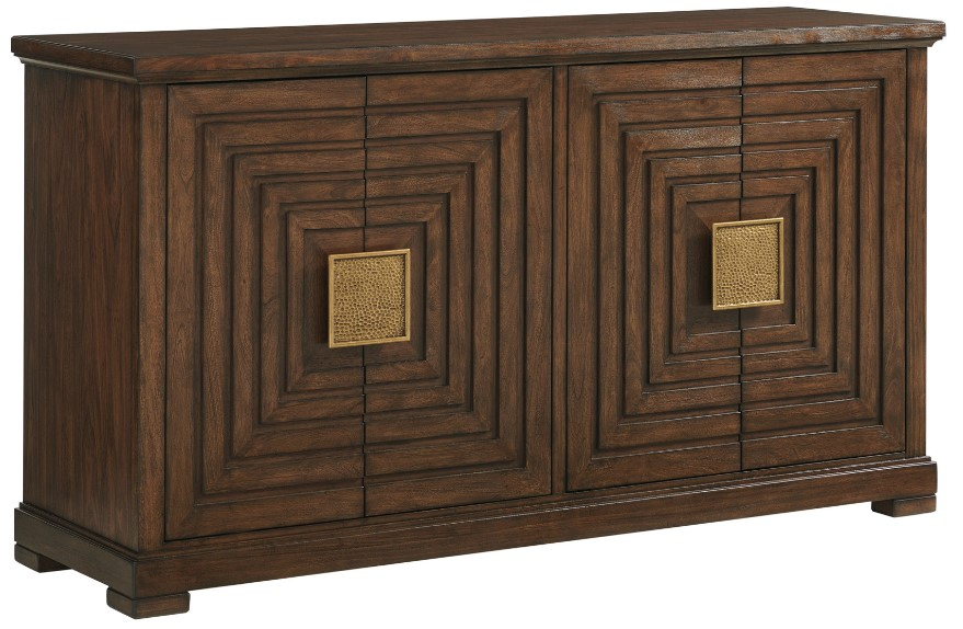 The architectural design of the doors and signature hardware make a striking design statement. Behind the doors are two felt-lined drawers at the top and four adjustable shelves below. One of the drawers is divided for silver storage. The Los Gatos buffet features a walnut top.Read More