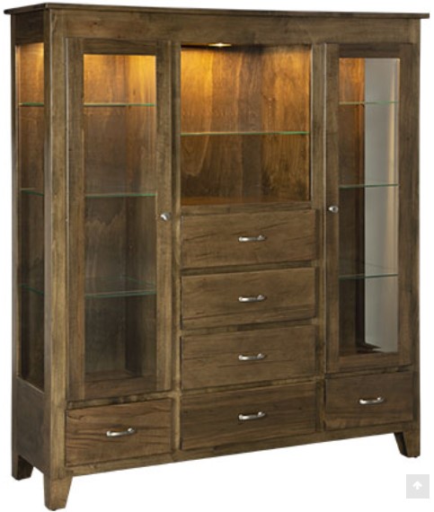 The Cosmo Display Hutch includes three adjustable glass shelves per door in the long doors and six storage drawers. Top center is open and has one adjustable glass shelf.Read More
