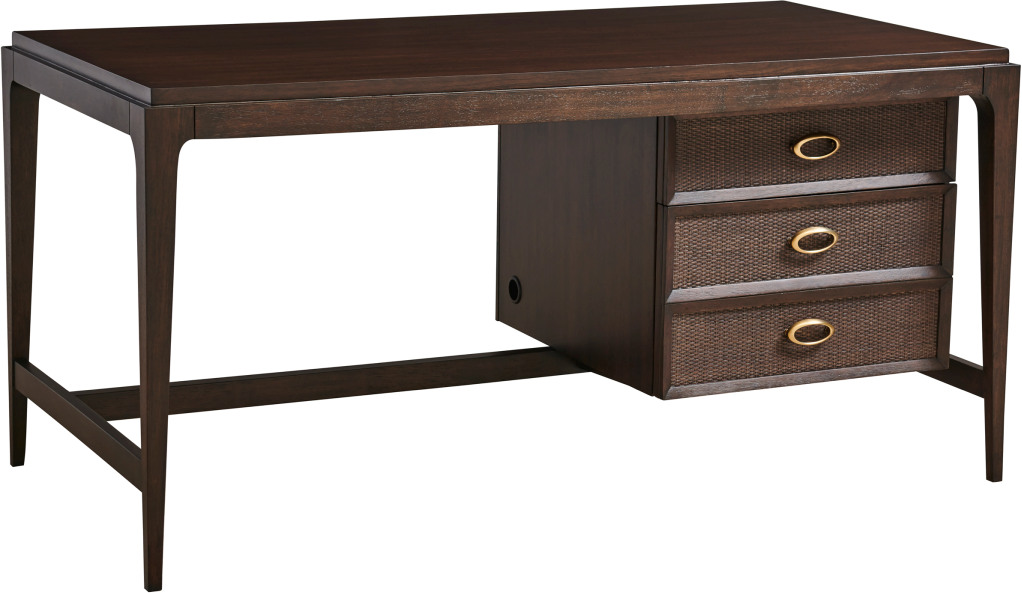 The 60-inch Irving writing desk is crafted from walnut in a deep mocha finish with woven cane accents of the offset drawer box. Custom oval hardware is finished in a champagne coloration. The design features a storage drawer above and a file drawer below that will accommodate letter or legal files.Read More