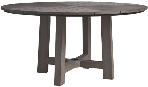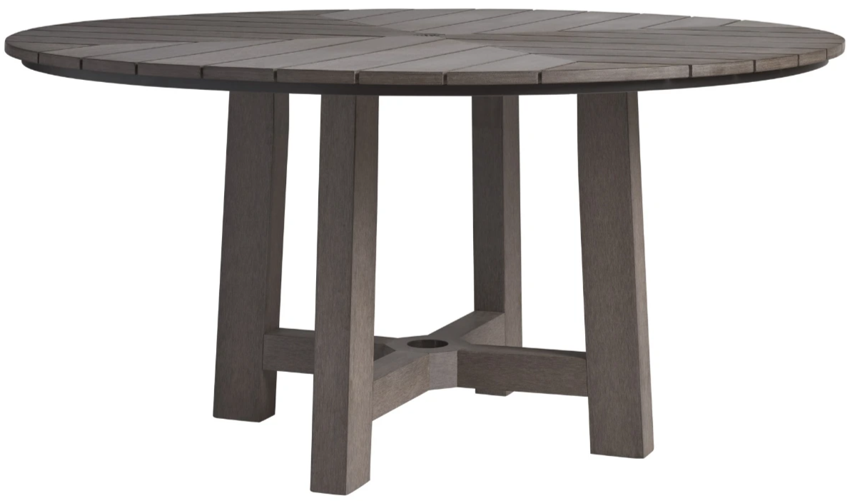 The 60-inch diameter dining table features an interesting chevron pattern radiating from the center. A pass-through in the center of the top accommodates an umbrella and the table is shipped with a decorative cap with the TB monogram when an umbrellas is not used.Read More