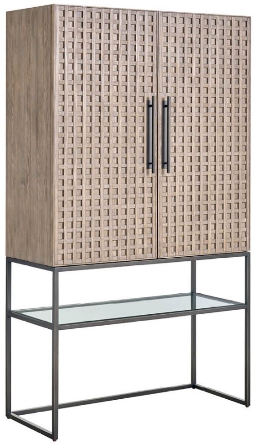 The boulder bar cabinet combines architectural detail with modern functionality. Featuring the collection's signature latticework design and a warm boulder medium-brown finish, its upper cabinet offers stylish storage, while the open metal base with a glass shelf provides a contemporary display area.Read More