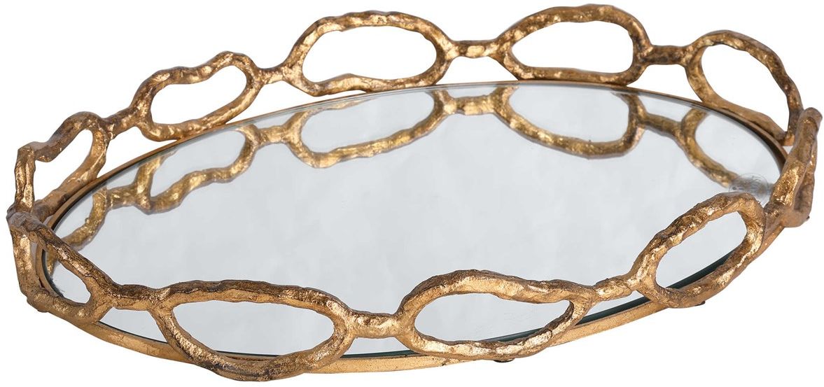 Frame made from 100% cast iron, this tray is finished in gold leaf with noticeable distressed details and a mirrored bottom.Read More