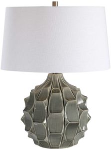 Scalloped ceramic base is finished in a light gray glaze with ivory rub-through details and is accented with plated brushed nickel details. The round tapered hardback shade is a white linen fabric with natural slubbing.Read More