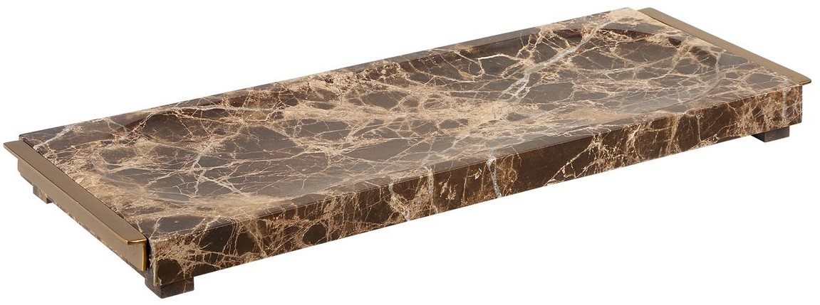 This luxurious tray is crafted from a thick marble slab featuring rich chocolates, black tones and striking cream veins. Completed with contemporary brass handles on each end making this tray a lesson in sophistication that is not only functional, but also a statement piece.Read More