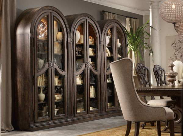 In storybook style, the romantic, softly-shaped Rhapsody Curio exudes casual opulence and classic European design pedigree. The laid-back luxury of the walnut-colored finish inspired by rustic reclaimed wood in beautiful patinas updates the curio for today's casual lifestyles. Behind two seeded glass doors are two top adjustable and wood-framed glass shelves with plate grooves. The center shelf is fixed, and the bottom two shelves are adjustable. Use this lovely curio alone, or bunched in twos or threes. The groundbreaking Rhapsody Collection brings together classic design elements, grand scale, and a relaxed rustic finish to create an impassioned marriage of casual opulence. Exuberant scale and serpentine shapes infuse the pieces with emotion, while timeless motifs like scrolls, rope twist molding, the acanthus leaf and fleur de lis anchor Rhapsody in old world charm. Building on the grand scale and classic European design is the defining element of the collection: a walnut-colored finish inspired by the natural yet rustic nature of reclaimed woods in beautiful patinas.