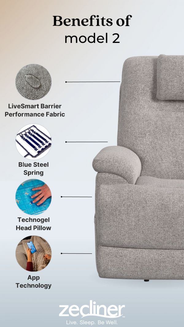 Live. Sleep. Be Well. Cozy up in the Zecliner Model 2 Power Lift Sleep Chair, your perfect family recliner by day, and haven for peaceful sleep by night. The zoned memory foam comfort areas in the backrest, seat, and shoulders; removable cooling head pillow; padded arms; and waterfall chaise provide surrounding comfort. The hand wand control lets you customize your comfort. Zero Gravity puts you in a state of weightlessness, and power lift assists when standing. This recliner is armed with reliable performance fabric upholstery that repels stains and spills, while being easy to clean. With Flexsteel's patented Blue Steel Spring™ at its core, this recliner has surrounding comfort for relaxation and slumber. Achieve blissful relaxation by day and a rejuvenating sleep by night with the Zecliner.